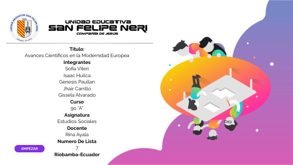 Título: Avances Científicos en la Modernidad Europea Integrantes Sofia Viteri Isaac Huilca Genesis Paullan Jhair Carrillo Gissela Alvarado Curso 9o “A” Asignatura Estudios Sociales Docente Rina Ayala Numero De Lista 7 Riobamba-Ecuador