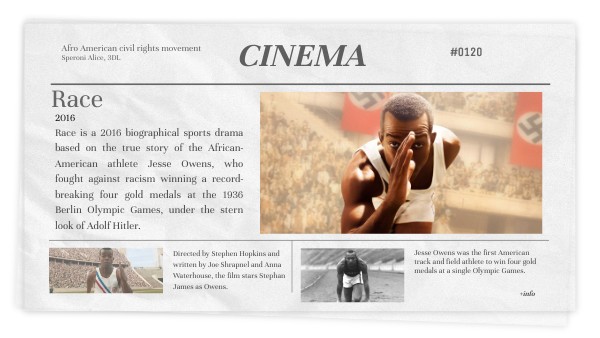 Race is a 2016 biographical sports drama based on the true story of the African-American athlete Jesse Owens, who fought against racism winning a record-breaking four gold medals at the 1936 Berlin Olympic Games, under the stern look of Adolf Hitler.