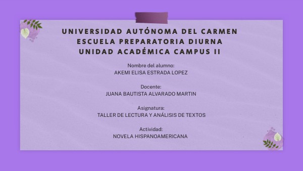 Nombre del alumno: AKEMI ELISA ESTRADA LOPEZ Docente: JUANA BAUTISTA ALVARADO MARTIN Asignatura: TALLER DE LECTURA Y ANÁLISIS DE TEXTOS Actividad: NOVELA HISPANOAMERICANA