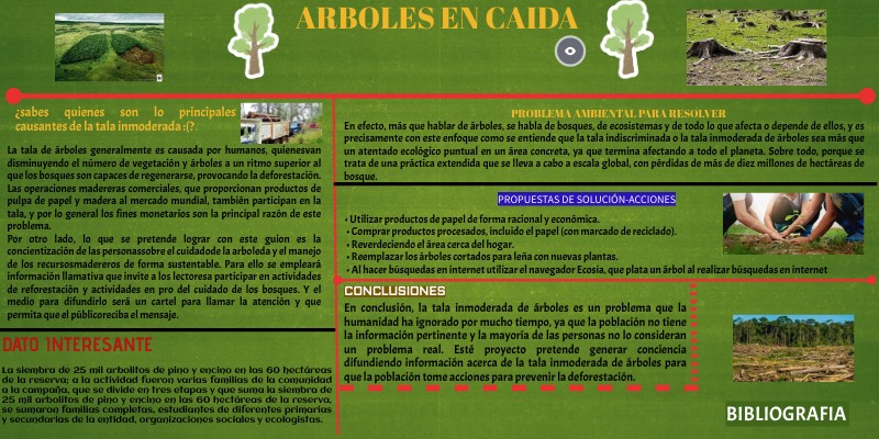 La tala de árboles generalmente es causada por humanos, quienesvan disminuyendo el número de vegetación y árboles a un ritmo superior al que los bosques son capaces de regenerarse, provocando la deforestación. Las operaciones madereras comerciales, que proporcionan productos de pulpa de papel y madera al mercado mundial, también participan en la tala, y por lo general los fines monetarios son la principal razón de este problema. Por otro lado, lo que se pretende lograr con este guion es la concientización de las personassobre el cuidadode la arboleda y el manejo de los recursosmadereros de forma sustentable. Para ello se empleará información llamativa que invite a los lectoresa participar en actividades de reforestación y actividades en pro del cuidado de los bosques. Y el medio para difundirlo será un cartel para llamar la atención y que permita que el públicoreciba el mensaje.