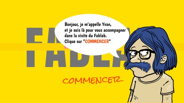 Bonjour, je m'appelle Yvan, et je suis là pour vous accompagner dans la visite du Fablab. Clique sur "COMMENCER"