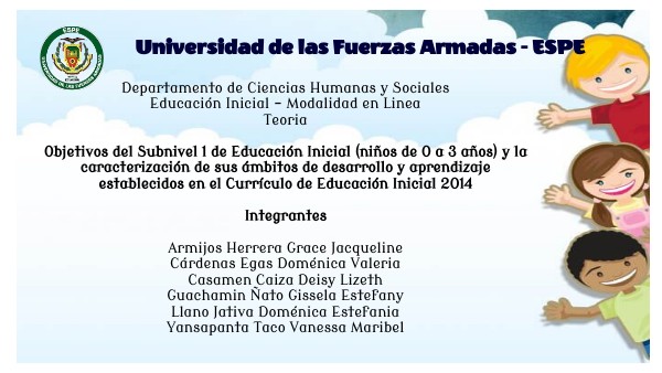 Departamento de Ciencias Humanas y Sociales Educación Inicial - Modalidad en Linea Teoria Objetivos del Subnivel 1 de Educación Inicial (niños de 0 a 3 años) y la caracterización de sus ámbitos de desarrollo y aprendizaje establecidos en el Currículo de Educación Inicial 2014 Integrantes Armijos Herrera Grace Jacqueline Cárdenas Egas Doménica Valeria Casamen Caiza Deisy Lizeth Guachamin Ñato Gissela Estefany Llano Jativa Doménica Estefania Yansapanta Taco Vanessa Maribel