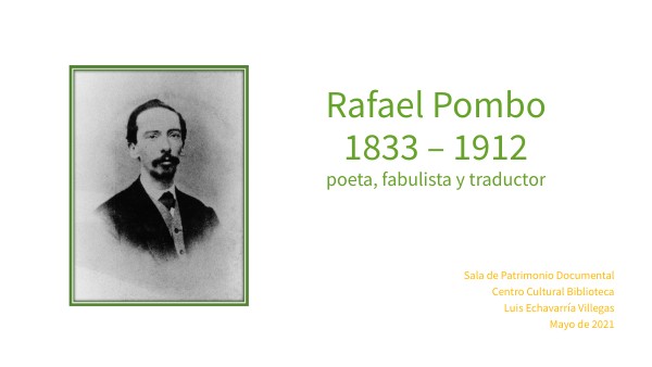 El 15 de mayo de este año se cumplen 110 años de la muerte de Rafael Pombo, destacado poeta, fabulista y traductor colombiano, quien dejó una vasta obra literaria que se lee aun en nuestros establecimientos de enseñanza y es lectura de muchos niños en nuestro país.Le rendimos un homenaje presentando una selección de sus obras que reposan en la Sala de Patrimonio Documental de la Biblioteca de la Universidad EAFIT y que se pueden leer en nuestra Biblioteca Digital Patrimonial: https://repository.eafit.edu.co/handle/10784/749