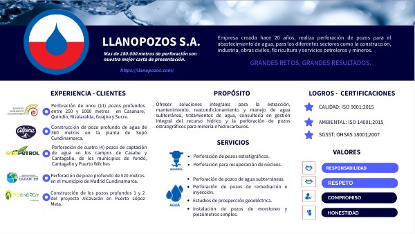 Empresa creada hace 20 años, realiza perforación de pozos para el abastecimiento de agua, para los diferentes sectores como la construcción, industria, obras civiles, floricultura y servicios petroleros y mineros.