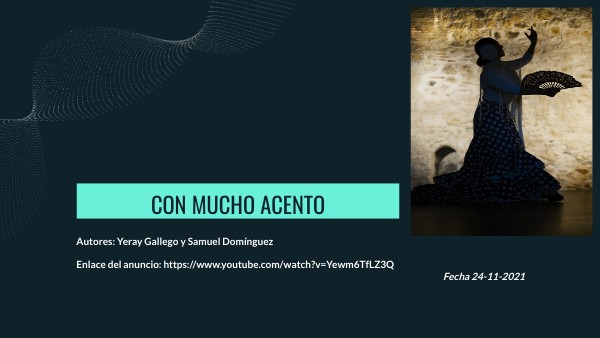 En este anuncio, vemos como nuestro acento es tan importante. Lola flores, una cantante, nos cuenta como se hizo tan conocida gracias a su acento.El emisor es Lola Flores que transmite un mensaje con la intención de no cambiar las raíces de nuestra cultura. Utiliza los bailes flamencos, la imagen de un caballo y de la costa para representar el arte y así reforzar dicha intención. El destinatario de este mensaje es para que todas aquellas personas se sientan orgullosas de sus raíces. Lola flores toma como referencia nuestro acento.