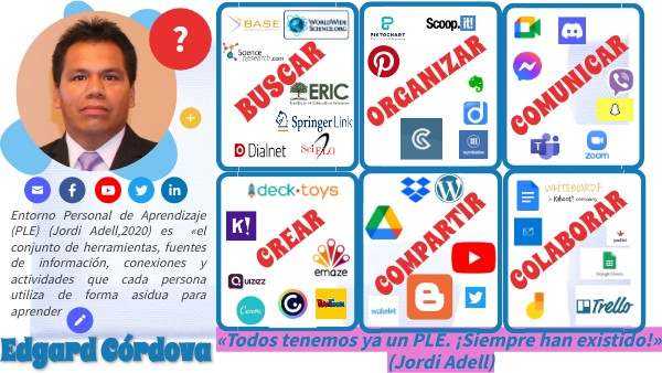 Entorno Personal de Aprendizaje (PLE) (Jordi Adell,2020) es «el conjunto de herramientas, fuentes de información, conexiones y actividades que cada persona utiliza de forma asidua para aprender