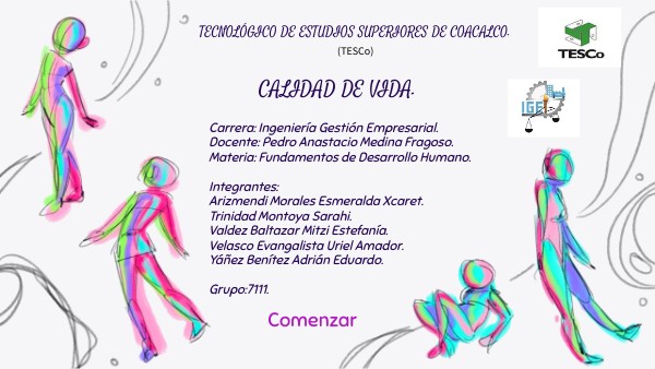 Carrera: Ingeniería Gestión Empresarial. Docente: Pedro Anastacio Medina Fragoso. Materia: Fundamentos de Desarrollo Humano. Integrantes:Arizmendi Morales Esmeralda Xcaret. Trinidad Montoya Sarahi. Valdez Baltazar Mitzi Estefanía. Velasco Evangalista Uriel Amador. Yáñez Benítez Adrián Eduardo. Grupo:7111.