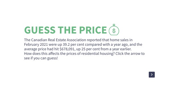 The Canadian Real Estate Association reported that home sales in February 2021 were up 39.2 per cent compared with a year ago, and the average price had hit $678,091, up 25 per cent from a year earlier. How does this affects the prices of residential housing? Click the arrow to see if you can guess!