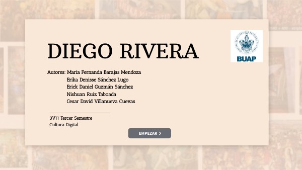 A. (1 de Abril de 2020). Diego Rivera: 5 murales fundamentales del genio mexican. Obtenido de Cultura Genial: https://www.culturagenial.com/es/obras-de-diego-rivera/ F, H. (19 de Febrero de 2021). Obtenido de allcitycanvas. : https://www.allcitycanvas.com/ murales-diego-rivera/ Frida Kahlo y Diego Rivera: registros históricos. (s.f.). Obtenido de (s. f.-b). Google Arts & Culture.: https://artsandculture.google.com/story/HAVxlFiuVTywFA?h l=es J, G. (25 de Noviembre de 2019). Historia National Geographic. Obtenido de historia.nationalgeographic.com.es: https://historia.nationalgeographic.com.es/a/diego-riverapintor-identidad-mexicana_14934 M. (6 de Julio de 2017). 7 grandes pinturas de Diego Rivera y dónde se encuentran. . .. MXCit. Obtenido de Guía de La Ciudad de México: https://mxcity.mx/2017/07/7-grandes-pinturas-de-diegorivera-y-donde-se-encuentran/ S, L. (1 de Noviembre de 2019). Lo que hay que saber sobre Diego Rivera. Obtenido de Aboutespanol: https://www.aboutespanol.com /diego-rivera-180001