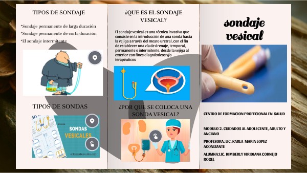 El sondaje vesical es una técnica invasiva que consiste en la introducción de una sonda hasta la vejiga a través del meato uretral, con el fin de establecer una vía de drenaje, temporal, permanente o intermitente, desde la vejiga al exterior con fines diagnósticos y/o terapéuticos