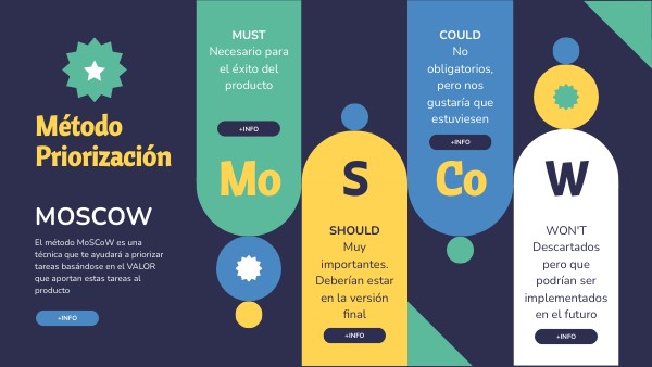El método MoSCoW es una técnica que te ayudará a priorizar tareas basándose en el VALOR que aportan estas tareas al producto