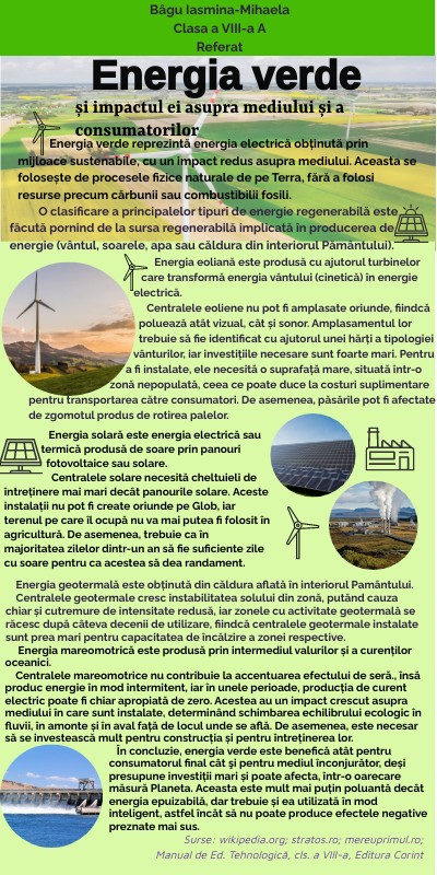 Energia verde reprezintă energia electrică obținută prin mijloace sustenabile, cu un impact redus asupra mediului. Aceasta se folosește de procesele fizice naturale de pe Terra, fără a folosi resurse precum cărbunii sau combustibilii fosili.