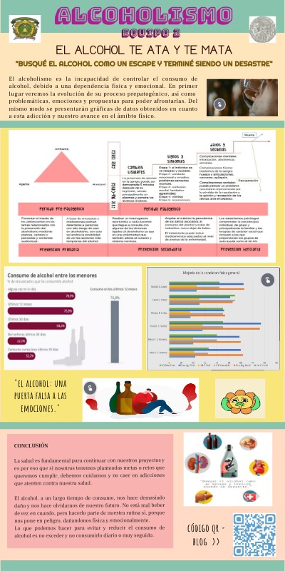 El alcoholismo es la incapacidad de controlar el consumo de alcohol, debido a una dependencia física y emocional. En primer lugar veremos la evolución de su proceso prepatogénico, así como problemáticas, emociones y propuestas para poder afrontarlas. Del mismo modo se presentarán gráficas de datos obtenidos en cuanto a esta adicción y nuestro avance en el ámibto físico.
