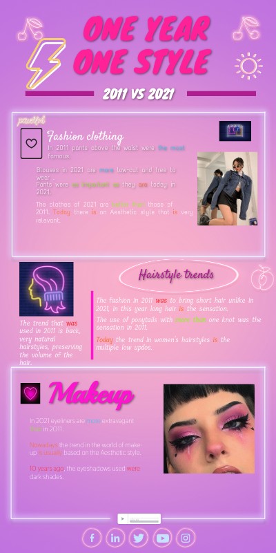 In 2021 eyeliners are more extravagant than in 2011 . Nowadays the trend in the world of make-up is usually based on the Aesthetic style. 10 years ago, the eyeshadows used were dark shades.