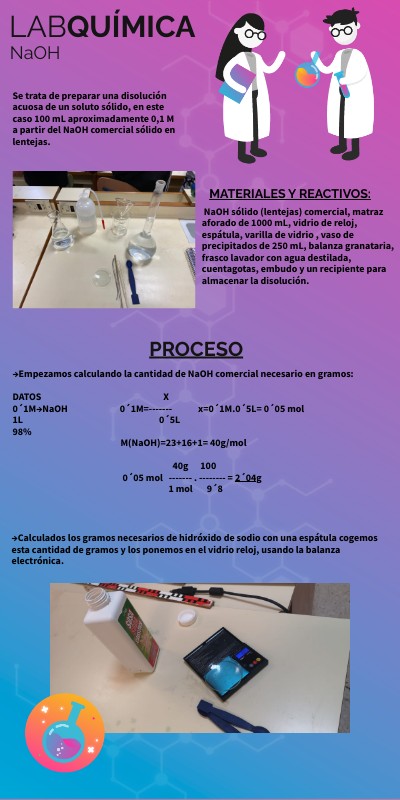 Se trata de preparar una disolución acuosa de un soluto sólido, en este caso 100 mL aproximadamente 0,1 M a partir del NaOH comercial sólido en lentejas.