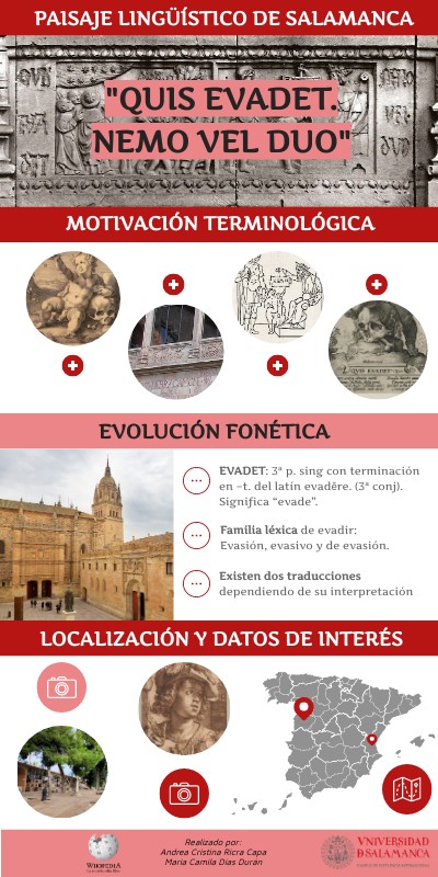 Paisaje lingüístico de Salamanca, inscripción del segundo enigma del claustro de la fachada de la Universidad de Salamanca : Quis evadet. Nemo vel duo.