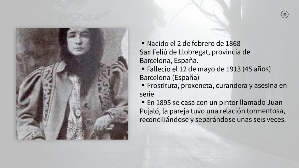 ▪︎Nacido el 2 de febrero de 1868San Feliú de Llobregat, provincia de Barcelona, España.▪︎Fallecio el 12 de mayo de 1913 (45 años) Barcelona (España) ▪︎Prostituta, proxeneta, curandera y asesina en serie ▪︎En 1895 se casa con un pintor llamado Juan Pujaló, la pareja tuvo una relación tormentosa, reconciliándose y separándose unas seis veces.