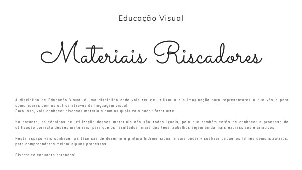 A disciplina de Educação Visual é uma disciplina onde vais ter de utilizar a tua imaginação para representares o que vês e para comunicares com os outros através da linguagem visual. Para isso, vais conhecer diversos materiais com os quais vais poder fazer arte. No entanto, as técnicas de utilização desses materiais não são todas iguais, pelo que também terás de conhecer o processo de utilização correcta desses materiais, para que os resultados finais dos teus trabalhos sejam ainda mais expressivos e criativos. Neste espaço vais conhecer as técnicas de desenho e pintura bidimensional e vais poder visualizar pequenos filmes demonstrativos, para compreenderes melhor alguns processos. Diverte-te enquanto aprendes!