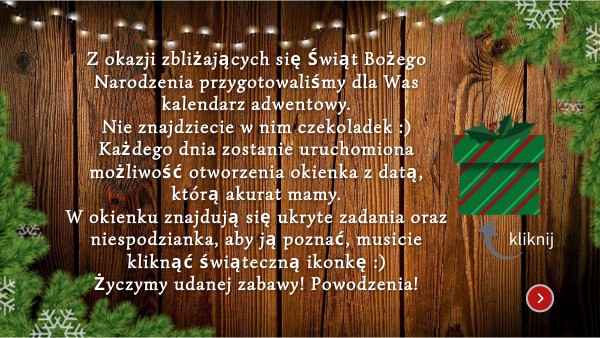 Z okazji zbliżających się Świąt Bożego Narodzenia przygotowaliśmy dla Was kalendarz adwentowy. Nie znajdziecie w nim czekoladek :) Każdego dnia zostanie uruchomiona możliwość otworzenia okienka z datą, którą akurat mamy. W okienku znajdują się ukryte zadania oraz niespodzianka, aby ją poznać, musicie kliknąć świąteczną ikonkę :) Życzymy udanej zabawy! Powodzenia!