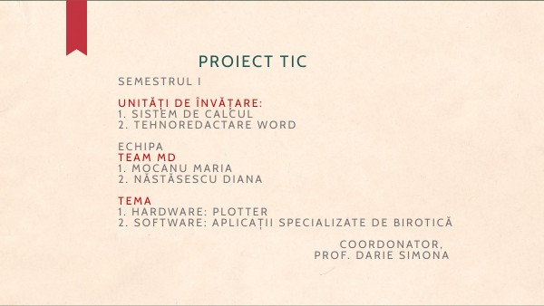 Semestrul I Unități de învățare: 1. Sistem de calcul 2. Tehnoredactare Word Echipa TEAM MD 1. MOCANU MARIA 2. NĂSTĂSESCU DIANA Tema 1. HARDWARE: Plotter 2. SOFTWARE: Aplicații specializate de birotică Coordonator, Prof. DARIE SIMONA