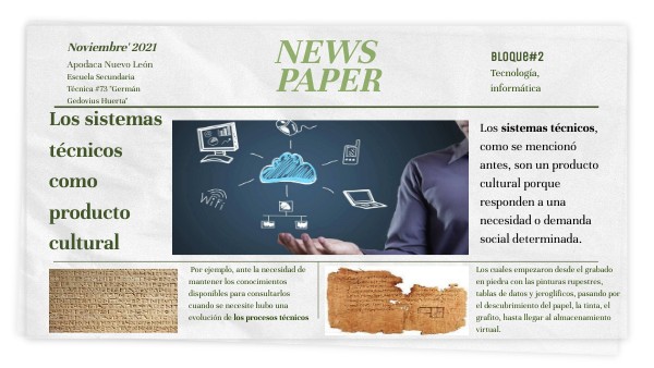 * Investiguen sobre un sistema técnico que esté presente en su comunidad (Apodaca, Monterrey o en todo el Estado) y responda o satisfaga una necesidad social o cultural.* Representen dicho sistema técnico en un esquema gráfico, utilicen cualquier herramienta electrónica que sea de su agrado. (cartel) * Expongan ante el grupo su esquema y expliquen los siguientes puntos :