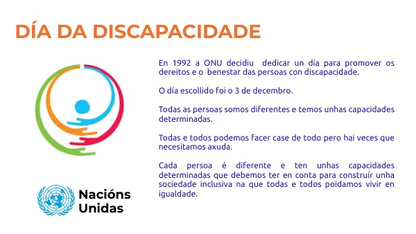 En 1992 a ONU decidiu dedicar un día para promover os dereitos e o benestar das persoas con discapacidade. O día escollido foi o 3 de decembro. Todas as persoas somos diferentes e temos unhas capacidades determinadas. Todas e todos podemos facer case de todo pero hai veces que necesitamos axuda. Cada persoa é diferente e ten unhas capacidades determinadas que debemos ter en conta para construír unha sociedade inclusiva na que todas e todos poidamos vivir en igualdade.
