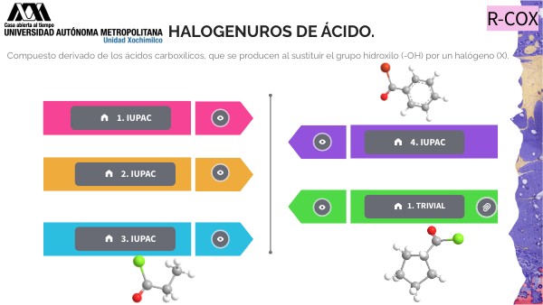 Compuesto derivado de los ácidos carboxílicos, que se producen al sustituir el grupo hidroxilo (-OH) por un halógeno (X).