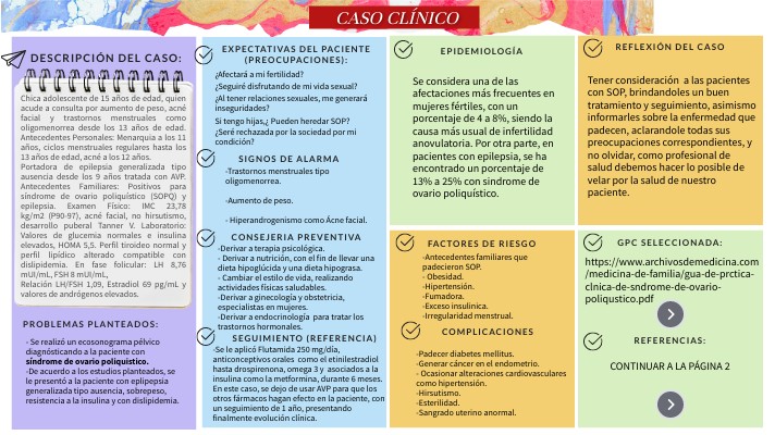 Chica adolescente de 15 años de edad, quien acude a consulta por aumento de peso, acné facial y trastornos menstruales como oligomenorrea desde los 13 años de edad. Antecedentes Personales: Menarquia a los 11 años, ciclos menstruales regulares hasta los 13 años de edad, acné a los 12 años.Portadora de epilepsia generalizada tipo ausencia desde los 9 años tratada con AVP. Antecedentes Familiares: Positivos para síndrome de ovario poliquístico (SOPQ) y epilepsia. Examen Físico: IMC 23,78 kg/m2 (P90-97), acné facial, no hirsutismo, desarrollo puberal Tanner V. Laboratorio: Valores de glucemia normales e insulina elevados, HOMA 5,5. Perfil tiroideo normal y perfil lipídico alterado compatible con dislipidemia. En fase folicular: LH 8,76 mUI/mL, FSH 8 mUI/mL, Relación LH/FSH 1,09, Estradiol 69 pg/mL y valores de andrógenos elevados.