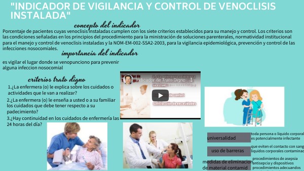 Porcentaje de pacientes cuyas venoclisis instaladas cumplen con los siete criterios establecidos para su manejo y control. Los criterios son las condiciones señaladas en los principios del procedimiento para la ministración de soluciones parenterales, normatividad institucional para el manejo y control de venoclisis instaladas y la NOM-EM-002-SSA2-2003, para la vigilancia epidemiológica, prevención y control de las infecciones nosocomiales.
