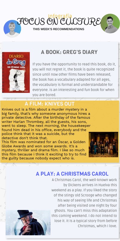 Knives out is a film about a murder mystery in a big family, that’s why someone anonymous hires a private detective. After the birthday of the famous writer Harlan Thrombey, all the guests, his sons, went to sleep. The next morning, the housekeeper found him dead in his office, everybody and the police think that it was a suicide, but the detective don’t think that.This film was nominated for an Óscar, a Golden Globe Awards and won some awards. It’s a mystery, thriller and drama film. I like so much this film because i think it exciting to try to find the guilty because nobody expect who is.