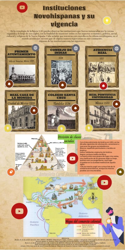 Es la cronología de la figura 3.20 puedes observar las instituciones que fueron instauradas por la corona española a lo largo de tres siglos, con la finalidad de mantener orden en los aspectos económico, político, social, cultural y religioso de la Nueva España. Cabe señalar que mientras esto sucedía en la colonia novohispana, en el mundo acontecían sucesos que de alguna manera repercutían en este continente. Algunas de las instituciones son las siguientes.