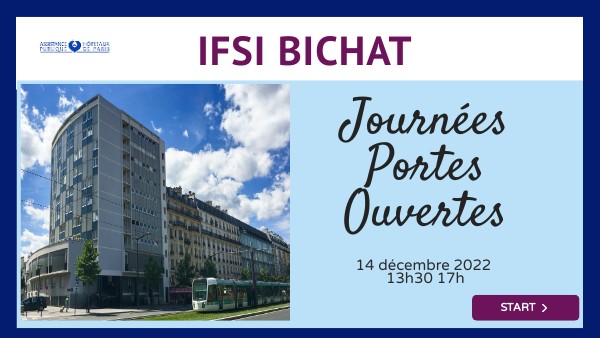 Bienvenue aux Portes Ouvertes de l'Institut de Formation en Soins Infirmiers Bichat. Cette visite virtuelle vous permettra d'accéder à des ressources et des rencontres en ligne.