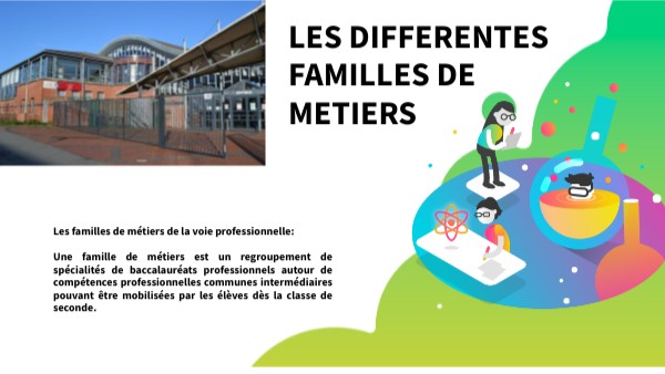 Les familles de métiers de la voie professionnelle: Une famille de métiers est un regroupement de spécialités de baccalauréats professionnels autour de compétences professionnelles communes intermédiaires pouvant être mobilisées par les élèves dès la classe de seconde.