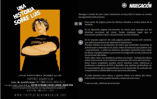 Navegar a través de este comic interactivo es muy fácil si tienes en cuenta las siguientes indicaciones:Para pasar de página pulsa las flechas situadas a ambos lados de la ventana.En la siguiente página encontrarás un menú para navegar por las distintas secciones del cómic. Desde cualquier lugar que te encuentres podrás volver a él pinchando en este símbolo.En la esquina superior de cada página puedes buscar este símbolo, que indica la presencia de elementos interactivos. Muchas viñetas se acompañan de textos que pretenden aumentar la información contenida en el cómic sobre el trastorno que padece Luis –esquizofrenia- y sobre los diversos abordajes existentes para tratar de aliviar el padecimiento y promover la integración social y laboral de las personas afectadas.Tanto ellas como sus familiares podrán encontrar orientación básica sobre cómo actuar en los distintos momentos del curso del trastorno.Estos textos ampliados pueden servir también como referencia a profesores y alumnos de ESO y Bachiller que quieran profundizar en el conocimiento de la esquizofrenia y en el desarrollo de actitudes de comprensión y solidaridad con las personas afectadas. Si estás leyendo estos textos, y quieres volver a la viñeta del cómic relacionda con ellos puedes hacerlo a traves de este icono. Y esto es todo. ¡Disfruta de la lectura!