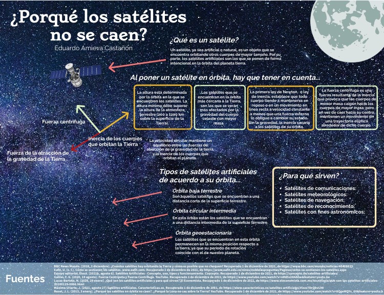BBC News Mundo. (2018, 2 diciembre). ¿Cuántos satélites hay orbitando la Tierra y cómo es posible que no choquen? Recuperado 1 de diciembre de 2021, de https://www.bbc.com/mundo/noticias-46408633 Eafit, U. (s. f.). Cómo se sostienen los satélites. www.eafit.com. Recuperado 1 de diciembre de 2021, de https://www.eafit.edu.co/ninos/reddelaspreguntas/Paginas/como-se-sostienen-los-satelites.aspx Equipo editorial, Etecé. (2021b, agosto 6). Satélites Artificiales - Concepto, uso, tipos y funcionamiento. Concepto. Recuperado 1 de diciembre de 2021, de https://concepto.de/satelites-artificiales/ Galilei, F. G. (2020, 19 agosto). Fuerza Centrípeta y Fuerza Centrífuga. YouTube. Recuperado 1 de diciembre de 2021, de https://www.youtube.com/watch?v=nKdSs284Ahw&feature=youtu.be Lucas-Bartolo, N. (2020, 29 enero). ¿Qué son los satélites artificiales y para qué sirven? El Economista. Recuperado 1 de diciembre de 2021, de https://www.eleconomista.com.mx/tecnologia/que-son-los-satelites-artificiales-20200129-0066.html Máxima Uriarte, J. (2021, agosto 27) Satélites artificiales. Caracteristicas.co. Recuperado 1 de diciembre de 2021, de https://www.caracteristicas.co/satelites-artificiales/#ixzz7DrQbvL90 Roset, J. L. (2013, 3 enero). ¿Porqué los satélites en órbita no caen?. ¿Porqué la Luna no cae sobre la Tierra? YouTube. Recuperado 1 de diciembre de 2021, de https://www.youtube.com/watch?v=8QgeMQYx_60&feature=youtu.b