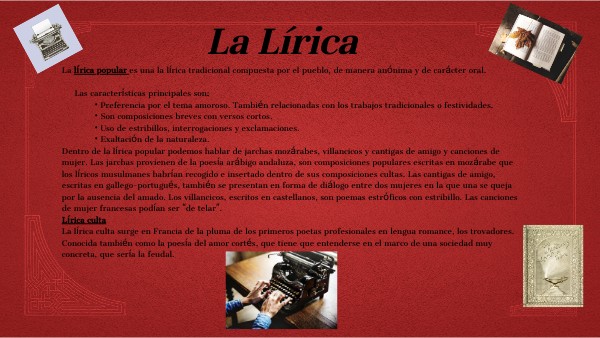 La lírica popular es una la lírica tradicional compuesta por el pueblo, de manera anónima y de carácter oral. Las características principales son: • Preferencia por el tema amoroso. También relacionadas con los trabajos tradicionales o festividades. • Son composiciones breves con versos cortos. • Uso de estribillos, interrogaciones y exclamaciones. • Exaltación de la naturaleza. Dentro de la lírica popular podemos hablar de jarchas mozárabes, villancicos y cantigas de amigo y canciones de mujer. Las jarchas provienen de la poesía arábigo andaluza, son composiciones populares escritas en mozárabe que los líricos musulmanes habrían recogido e insertado dentro de sus composiciones cultas. Las cantigas de amigo, escritas en gallego-portugués, también se presentan en forma de diálogo entre dos mujeres en la que una se queja por la ausencia del amado. Los villancicos, escritos en castellanos, son poemas estróficos con estribillo. Las canciones de mujer francesas podían ser “de telar”. Lírica culta La lírica culta surge en Francia de la pluma de los primeros poetas profesionales en lengua romance, los trovadores. Conocida también como la poesía del amor cortés, que tiene que entenderse en el marco de una sociedad muy concreta, que sería la feudal.