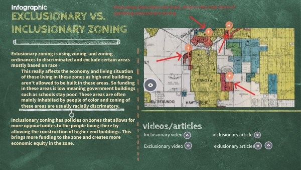 Exlusionary zoning is using zoning and zoning ordinances to discriminated and exclude certain areas mostly based on raceThis really affects the economy and living situation of those living in these zones as high end buildings aren't allowed to be built in these areas. So funding in these areas is low meaning government buildings such as schools stay poor. These areas are often mainly inhabited by people of color and zoning of these areas are usually racially discrimatory.
