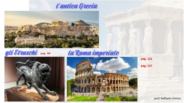 GLI ETRUSCHI LEZ.1: Cenni storici - il sarcofago degli sposi - l'arringatore - la chimera L'ANTICA ROMA LEZ.2: cenni storici - il Pantheon - la colonna traiana; il Colosseo; LEZ.3: il circo massimo; il monumento equestre a Marco Aurelio; l'Ara pacis; la Domus, la villa, villa Adriana a Tivoli