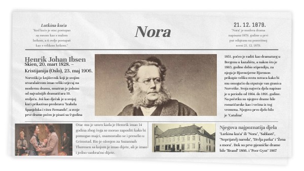 "Nora" je modera drama napisana 1879. godine a prvi put odigrana na pozorišnoj sceni 21. 12. 1879.
