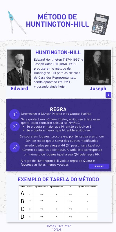 Edward Huntington (1874-1952) e Joseph Adna Hill (1860-1938) propuseram o método de Huntington-Hill para as eleições da Casa dos Representantes, sendo aprovado em 1941, vigorando ainda hoje.