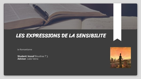 " Le romantisme est un mouvement littéraire et culturel du XIX e siècle . Et qui se définit comme l'expression de la sensibilité de l'artiste, notamment des sentiments moraux, et plus particulièrement de son mal-être. Ainsi le romantisme est un mouvement centré sur la sensibilité et le "Moi" "