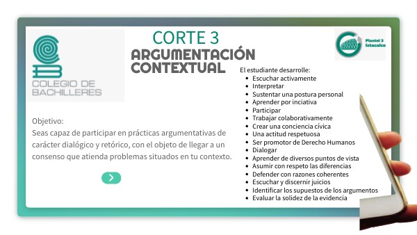 Objetivo:Seas capaz de participar en prácticas argumentativas de carácter dialógico y retórico, con el objeto de llegar a un consenso que atienda problemas situados en tu contexto.