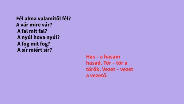 Fél alma valamitől fél? A vár mire vár? A fal mit fal? A nyúl hova nyúl? A fog mit fog? A sír miért sír?