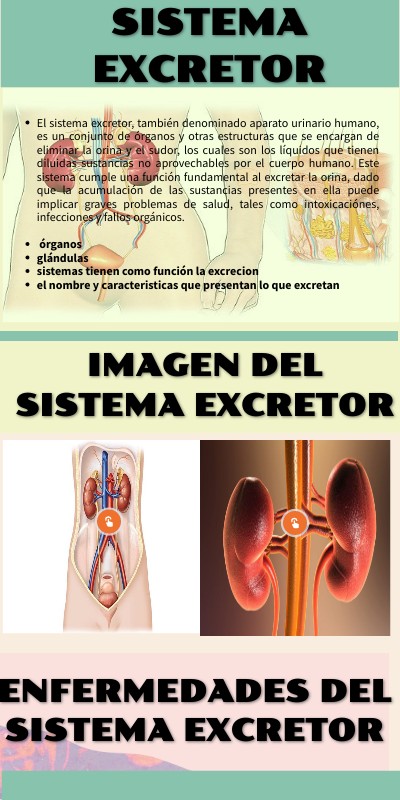 - El sistema excretor, también denominado aparato urinario humano, es un conjunto de órganos y otras estructuras que se encargan de eliminar la orina y el sudor, los cuales son los líquidos que tienen diluidas sustancias no aprovechables por el cuerpo humano. Este sistema cumple una función fundamental al excretar la orina, dado que la acumulación de las sustancias presentes en ella puede implicar graves problemas de salud, tales como intoxicaciónes, infecciones y fallos orgánicos.