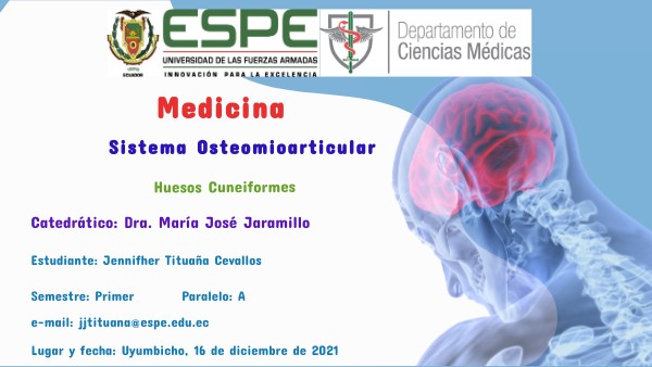 1. Schunke, M., Schulte, E. & Schumacher, U. Prometheus. Texto y Atlas de Antomía. [Internet]. 5ta ed. Madrid: Médica Panamericana; 2018 [fecha de consulta 10 de diciembre de 2021]. Págs. 424, 425. Tomo 1. Anatomía general y aparato locomotor . Disponible en: https://www.medicapanamericana.com/VisorEbookV2/Ebook/9788491106265?token=e016d8fa-ad05-469c-ab60-1da3053710c9#{%22Pagina%22:%22425%22,%22Vista%22:%22Indice%22,%22Busqueda%22:%22%22} 2. Nielsen, M. & Miller, S. Atlas de Anatomía Humana. [Internet]. 1a ed. Madrid: Editorial Médica Panamericana; 2012 [fecha de consulta 10 de diciembre de 2021]. Págs. 144, 199. Capítulo 6 Esqueleto Apendicular. Disponible en: https://www.medicapanamericana.com/VisorEbookV2/Ebook/9788498355901?token=cf08b3b6-c403-416a-8690-c4441d4a5f35#{%22Pagina%22:%22119%22,%22Vista%22:%22Indice%22,%22Busqueda%22:%22%22}3. Pró, E. Anatomía Clínica. [Internet]. 2a ed. Buenos Aires: Médica Panamericana; 2014 [fecha de consulta 10 de diciembre de 2021]. Págs. 897-900. Capítulo 9 Miembros inferiores. Disponible en: https://www.medicapanamericana.com/VisorEbookV2/Ebook/9789500606431?token=47a8fe9b-2778-45c3-94f9-f2f526f74d7f#{%22Pagina%22:%22900%22,%22Vista%22:%22Indice%22,%22Busqueda%22:%22%22} 4. García, J. & Hurlé, J. Anatomía Humana. [Internet]. 2a ed. Madrid: Médica Panamericana; 2020 [fecha de consulta 10 de diciembre de 2021]. Pág. 221. Capítulo 6 Aparato locomotor: extremidad inferior. Disponible en: https://www.medicapanamericana.com/VisorEbookV2/Ebook/9788491102113?token=c0793a9f-3d73-4368-a726-5c706cdcb950#{%22Pagina%22:%22221%22,%22Vista%22:%22Indice%22,%22Busqueda%22:%22%22} 5. Huesos CUÑAS o CUÑEIFORMES │Qué son, significado, ubicación, función y lesiones [Internet]. Youtube; 2020 [citado el 11 de diciembre de 2021]. Disponible en: https://www.youtube.com/watch?v=laMtyDenXdk 6. Barr, R. & Maehlum, S. [Internet]. 6a ed. Madrid: Editorial Médica Panamericana.; 2007 [fecha de consulta 10 de diciembre de 2021]. Pág. 426. Capítulo 15 Pie. Disponible en: https://books.google.com.ec/books?id=hwjI3fCHe7cC&pg=PA426&dq=lesiones+huesos+cuneiformes+pie&hl=es&sa=X&ved=2ahUKEwjYxs3wyeP0AhVRSTABHf4ODpsQ6AF6BAgCEAI#v=onepage&q=lesiones%20huesos%20cuneiformes%20pie&f=false7. Orozco-Villaseñor SL, Turrubiates-Lucero E, Miguel-Andrés I, Martínez-Rodríguez FJ, Mendoza-Bañuelos E, Purata-Kury RM et al . Luxación expuesta de la primera y segunda cuña y fractura in situ de la tercera cuña del pie: caso clínico y revisión de la literatura. Acta ortop. mex [revista en la Internet]. 2019 Ago [citado 2021 Dic 14] ; 33( 4 ): 256-260. Disponible en: http://www.scielo.org.mx/scielo.php?script=sci_arttext&pid=S2306-41022019000400256&lng=es. Epub 06-Ago-2021.