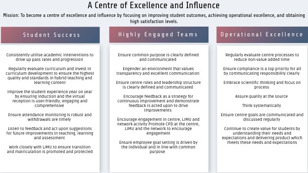 Mission: To become a centre of excellence and influence by focusing on improving student outcomes, achieving operational excellence, and obtaining high satisfaction levels.