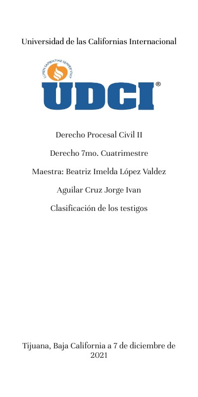 Derecho Procesal Civil II Derecho 7mo. Cuatrimestre Maestra: Beatriz Imelda López Valdez Aguilar Cruz Jorge Ivan Clasificación de los testigos Tijuana, Baja California a 7 de diciembre de 2021