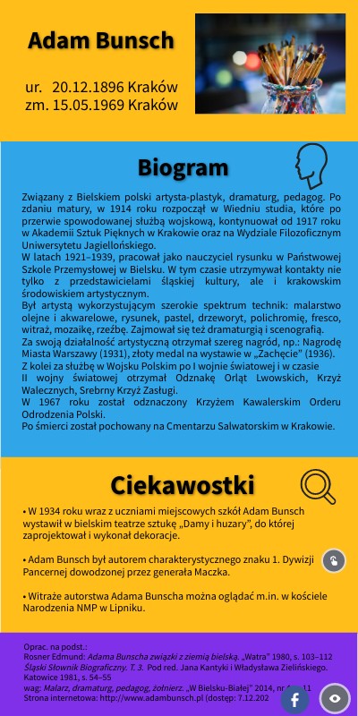 Oprac. na podst.: Rosner Edmund: Adama Bunscha związki z ziemią bielską. „Watra” 1980, s. 103–112Śląski Słownik Biograficzny. T. 3. Pod red. Jana Kantyki i Władysława Zielińskiego. Katowice 1981, s. 54–55wag: Malarz, dramaturg, pedagog, żołnierz. „W Bielsku-Białej” 2014, nr 4, s. 11Strona internetowa: http://www.adambunsch.pl (dostęp: 7.12.202