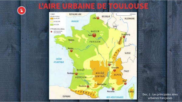 1. Situez l'aire urbaine de Toulouse (doc. 1). 2. Quels sont les trois espaces qui composent l'aire urbaine de Toulouse ? (doc. 2) 3. A quel espace de l'aire urbaine toulousaine correspond chacun de ces paysages urbains ? (doc. 3, 4 et 5)