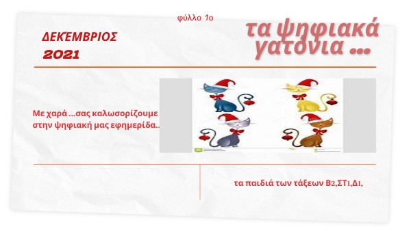Μέσα από το περιοδικό μας, που θα το βρίσκετε «κρεμασμένο» στην ιστοσελίδα του σχολείου μας, θα σας ενημερώνουμε για διάφορες πρωτοβουλίες που θα αναλάβουμε κατά τη διάρκεια της φετινής σχολικής χρονιάς, για διάφορες δράσεις που θα κάνουμε με τους δασκάλους μας και βέβαια, θα ακούτε την άποψή και τα σχόλιά μας για διάφορα θέματα! Σε αυτή τη συλλογική προσπάθεια συμμετέχουν, εκτός από εμάς, οι τάξεις Β2,Και Δ1 αλλά και μαθητές άλλων τμημάτων στο μάθημα των αγγλικών.Η ιδέα της δημιουργίας του περιοδικού ξεκίνησε από μερικούς εκπαιδευτικούς του σχολείου μας και μας βρήκε όλες και όλους απόλυτα σύμφωνους. Έτσι, γεννήθηκαν τα ΨΗΦΙΑΚΑ ΓΑΤΟΝΙΑ, που θέλουμε να αποτελέσουν την ψηφιακή μαθητική φωνή του σχολείου μας.